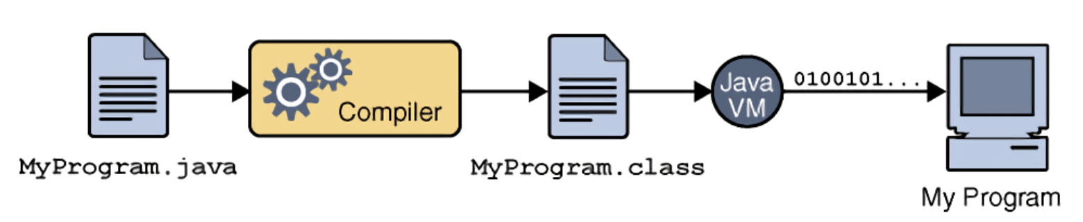 - 컴파일러(Compiler)는 자바 소스코드를 이용하여 클래스 파일(MyProgram.class)을 생성